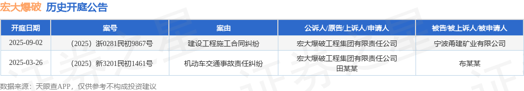 发布日期:2025-09-16 00:06 点击次数:105本站消息,根据天眼查APP显示,近日公布了一则宏大爆破工程集团有限责任公司作为原告/上诉人的开庭公告,详细内容如下: